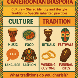 When we talk about identity, two words often come up: culture and tradition. They are closely linked, but they are not the same. Understanding the difference helps us appreciate how Cameroonians in the diaspora maintain their roots while adapting to new environments.